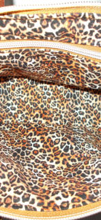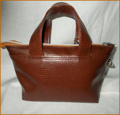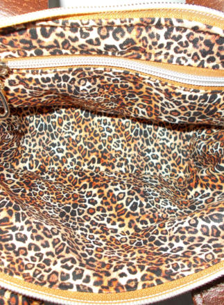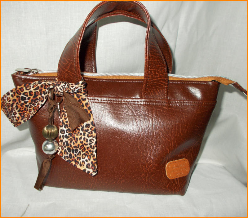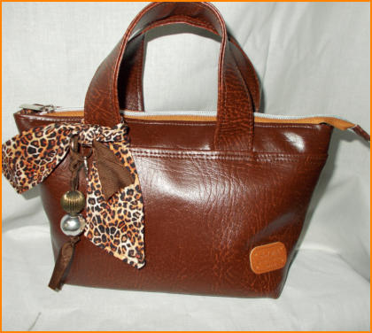 TINA TOTE IN dark tan10”(26CM) across top of bage 20CM x 8”at bottom and wide base 10cm(4”) x 20cm 8”This lovely small bag (with a big inside, the wide base gives it is inner size )has grab handles, in grained dark tan vinyl a leopard print scarf with bag charm on front,leoprint ling 100% fabric
