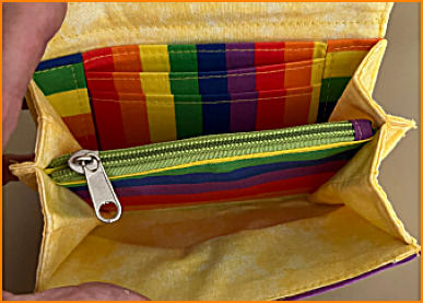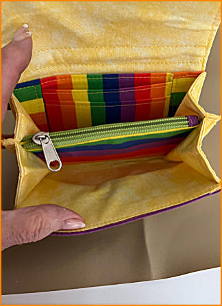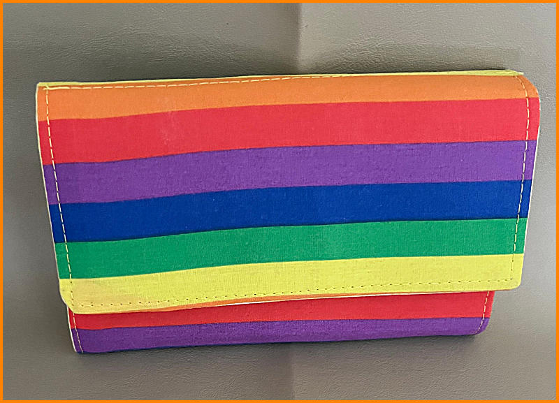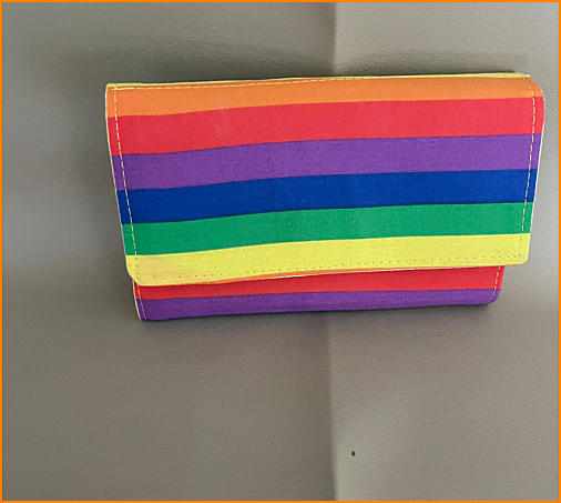 Small accordian purseIn cotton rainbow fabric (gay pride colours)with cotton interior, zip coin compartment and bank card slots magnetic claspsize 6” x4” 15cm x10cm£10.00