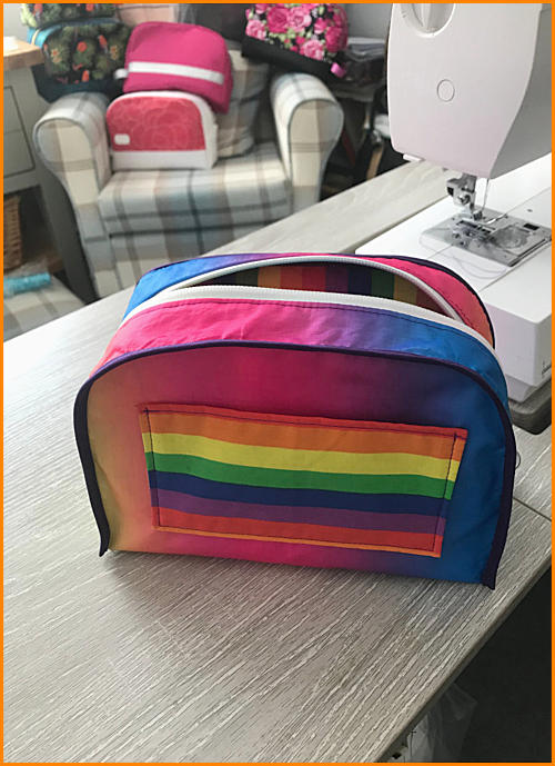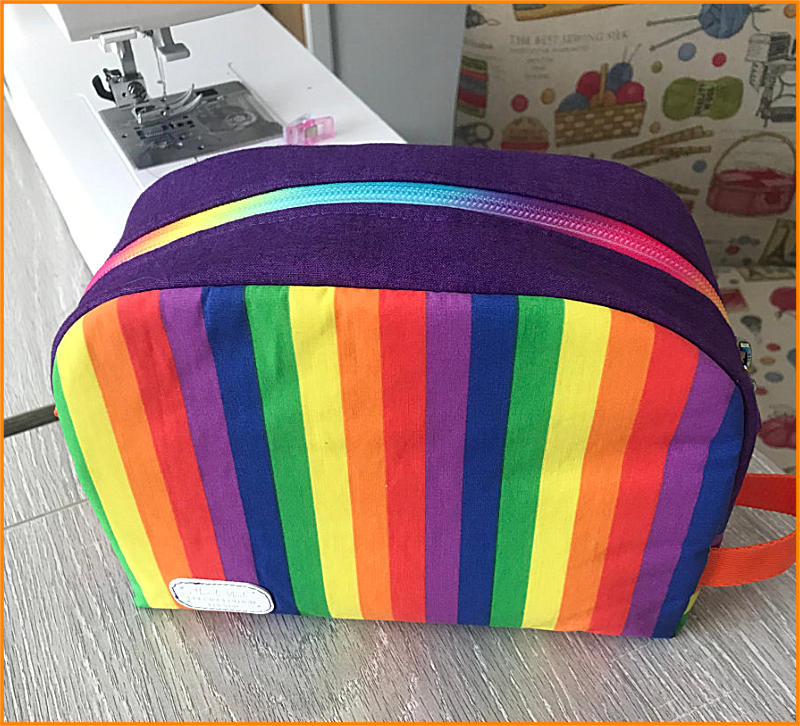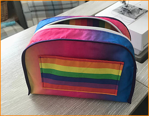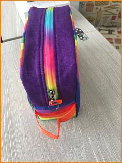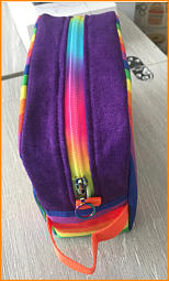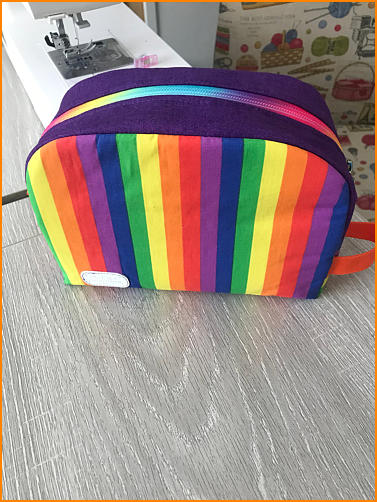 small toilet bag in gay pride rainbow cotton, rainbow zip. interior rainbow ripstop fabric with cotton pocket.interior lining is water resistantorange webbing grab strap on sidesize 8”w x6”h x3”d21cm x16cm 8cm£10.00