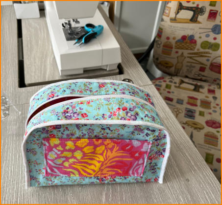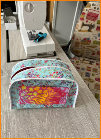Small Pink abstract toilet bag100% cotton fabric in blues/pinks water resitant base which has a deep pink. interior blue floral 100% cotton and contrasting pocket. removable plastic base liner insidepink webbing grab strap on sidesize 8” w x 6”h x 3”d21cm x 16cm x 8cm £10.00